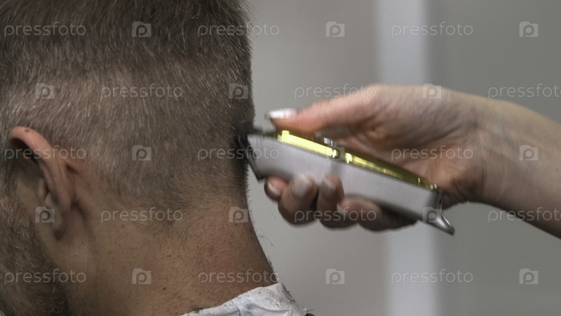 Экспертный парикмахер тщательно обрезает волосы вокруг шейки с помощью золотой клипперы в спокойной обстановке салона