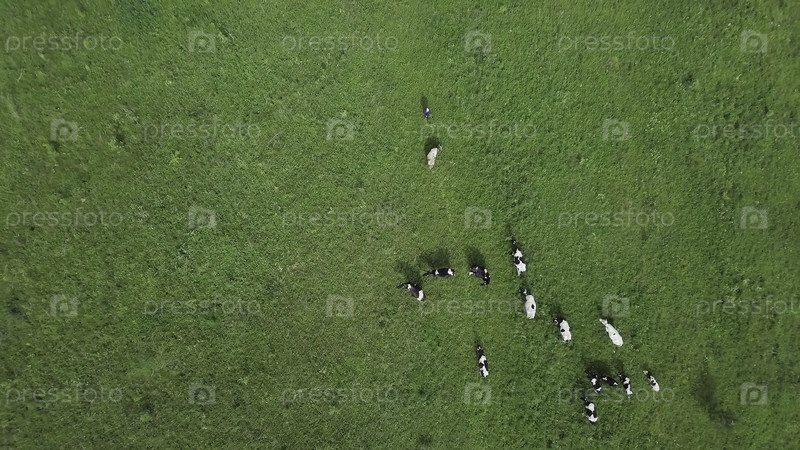 С воздушной точки зрения стадо коров пасется на яркой зеленой траве поля внизу