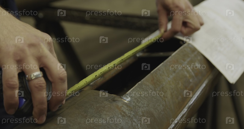 Ближайший снимок квалифицированных рук, измеряющих металлический кусок, демонстрирующий исключительное мастерство в изготовлении