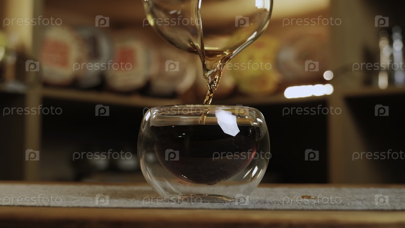 Это видео демонстрирует спокойный ритуал приготовления напитков, сосредоточившись на искусстве наливания чая и кофе в элегантных стеклянных стаканах