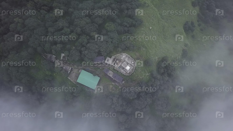 Потрясающий взгляд с воздуха на мирный пейзаж со строениями, расположенными в горах