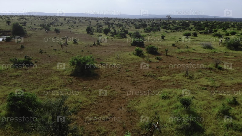 Безмятежные воздушные снимки дикой природы, отдаленный ландшафт лугов с демонстрацией пасущихся антилопов возле воды