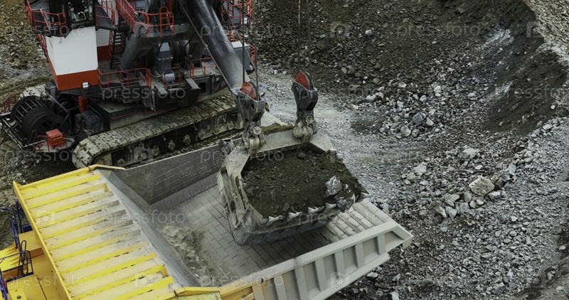 Экскаватор загружает самосвалы в карьере, добыча полезных ископаемых
