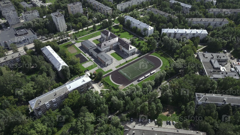 Вид с воздуха здания школы и спортивного поля в жилом районе