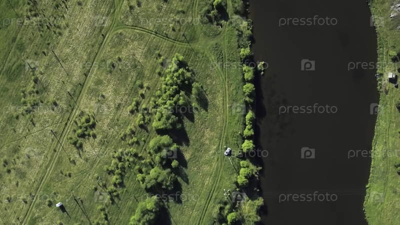 Потрясающий аэрофотосъемка демонстрирует спокойную реку, которая красиво окрашена яркой и пышной зеленой лиственницей