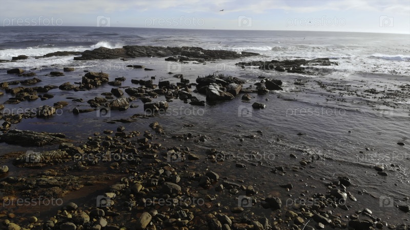 Береговая линия с особенностями морской жизни, естественным окружением приливного бассейна, демонстрирующим гальки и водоросли