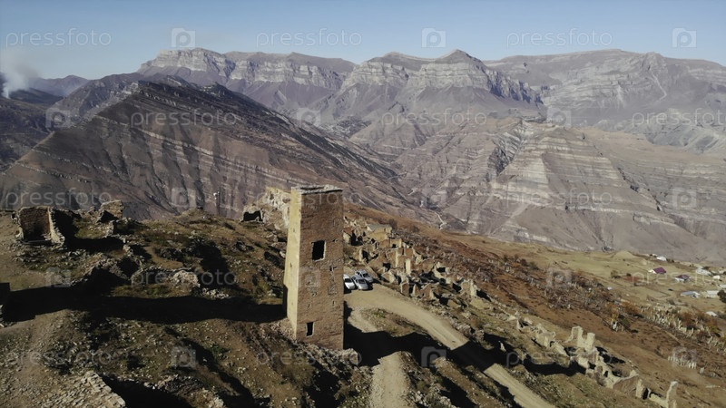 Вид с воздуха древних кавказских горных каменных башен.СМИ
