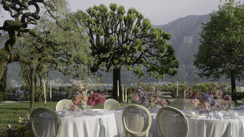Элегантная установка столовой на открытом воздухе находится в идеальном месте среди красивого живописного фона