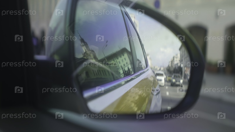 Красиво отражающий вид потрясающего городского пейзажа, запечатленный в зеркале автомобиля, демонстрирует яркую городскую жизнь