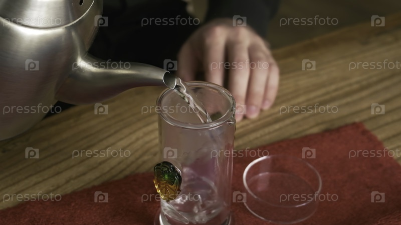 Спокойное видео показывает, как кто-то наливает кипящую воду из чайника в стеклянную чашку на столе, создавая успокаивающую атмосферу и празднуя приготовление чая