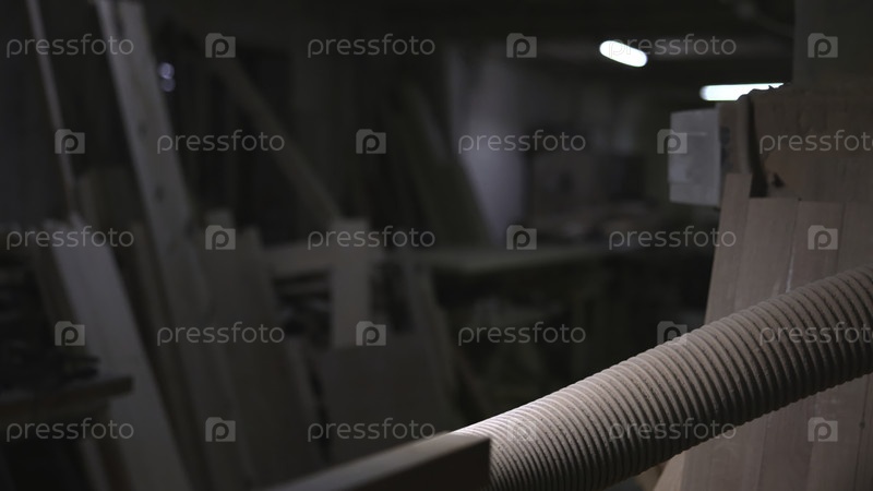 Гибкая вытяжная труба в мастерской, универсальный коллектор пыли шланг с размытой машиной на заднем плане