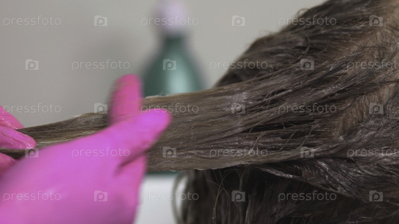 Процесс сглаживания, стилист деликатно применяет продукт, близкий взгляд на обработку волос в салоне