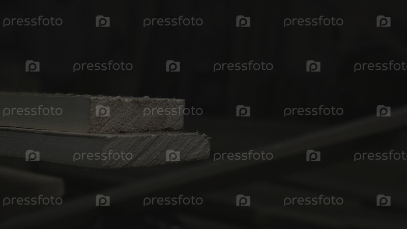 Приглушенное освещение подчеркивает текстурированные зерна и винтажную патину на сложенных деревянных досках в тихом хранилище