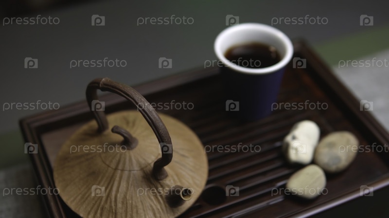 Спокойная чайная конфигурация с изготовленным глиняным чайником, соответствующей чашей и декоративными камнями на деревянной подносе