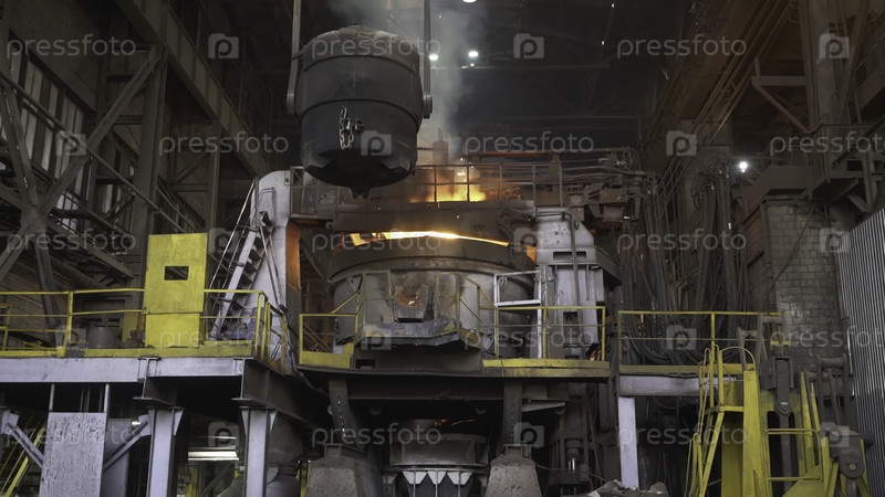 Расплавленный металл наливается в большую промышленную печь