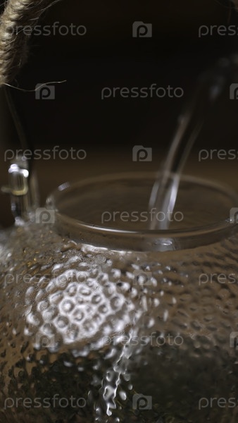 Ближайший снимок воды, которая наливается в текстурированный стеклянный чайник, подчеркивая элегантность и спокойствие