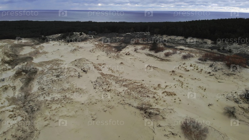 Вид с воздуха, летящий над прибрежными песчаными дюнами и лесом