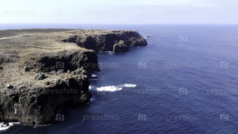 Прибрежная скала Виста, потрясающий взгляд с воздуха на турбулентный океан встречает темные скалы под ярким солнечным светом