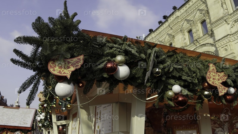 Рождественские декорации украшают праздничный рыночный киоск на Красной площади, Москва