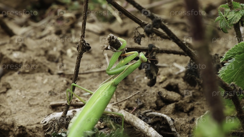 Живая зеленая саранча, которая плавно вписывается в земное и пышное окружение.Медиа