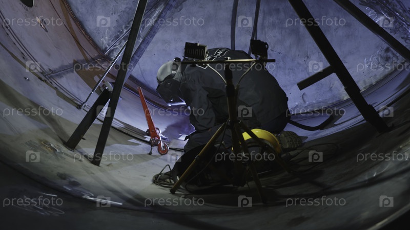 Опытный сварщик выполняет задачи внутри большого цилиндрического резервуара, демонстрируя мастерство и опыт