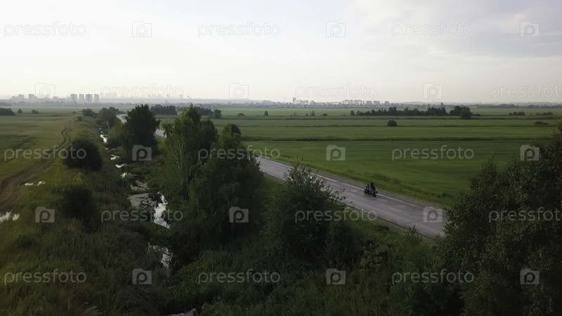 Аэрофотосъемка мотоциклиста, едущего по сельской дороге