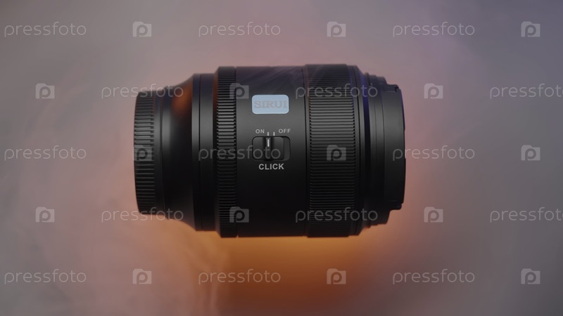 Рим, Италия - апрель 2025 года: современный телеобъектив вращается на белом фоне с красно-синим освещением