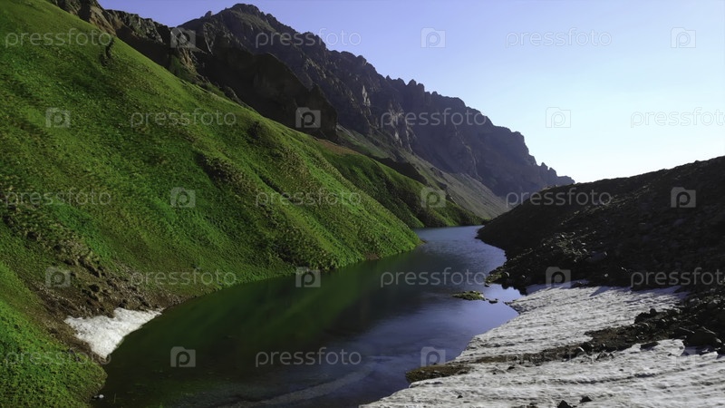 Безмятежная высокогорная водная сцена, нетронутое альпийское водоема отражающее пышные зеленые склоны со снегом