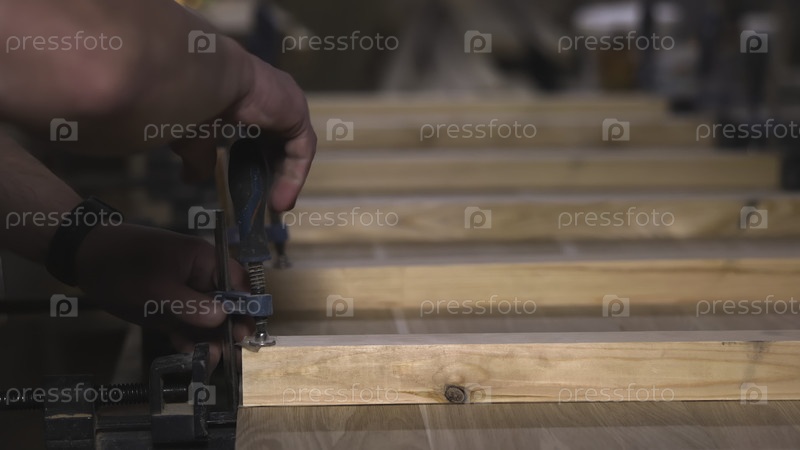Detailed View Of Hands Fastening Clamp Onto Neatly Arranged Wooden Planks In Workshop Setting. СМИ Подробное представление о застежке для прикрепления рук к аккуратно расположенным деревянным доскам в условиях мастерской