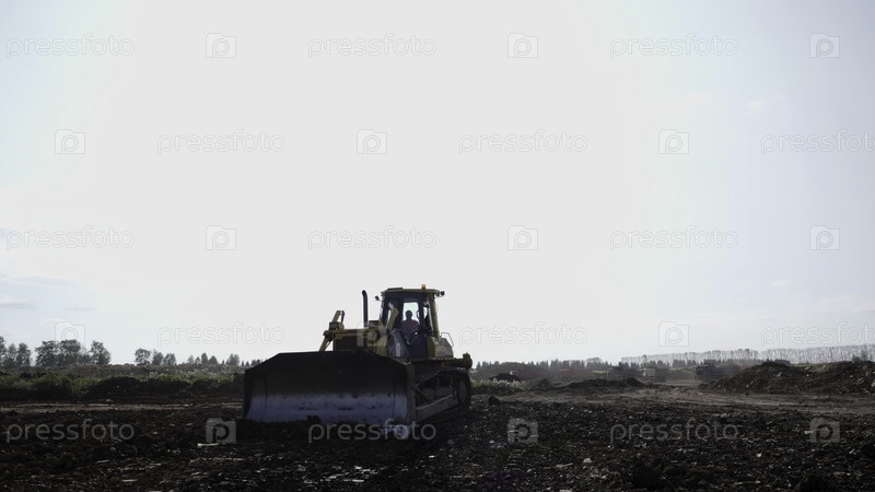 Бульдозер, перемещающий землю на строительной площадке