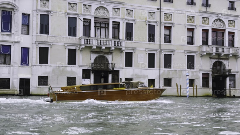 Классическая деревянная лодка-такси плавает по Большому каналу, демонстрируя венецианскую архитектуру