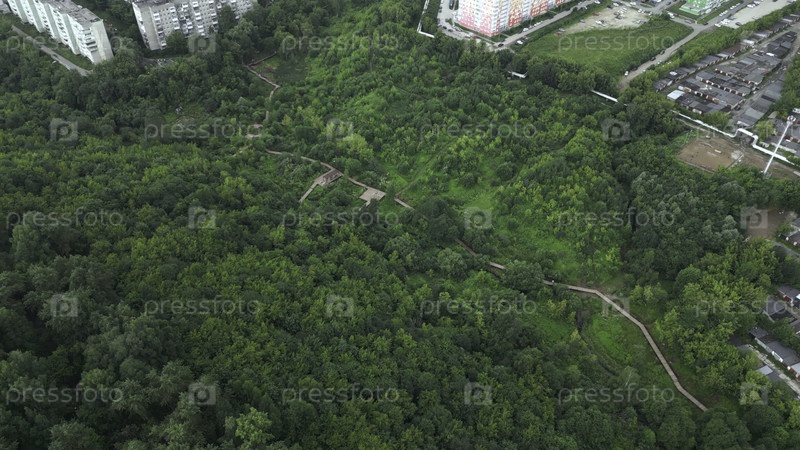 Вид с воздуха, летящий над зеленым городским парком и лесом