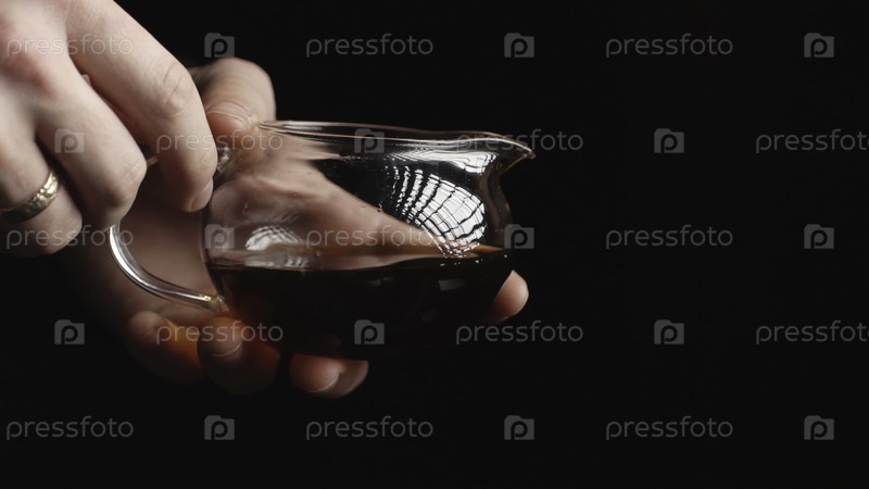 Рука, твердо держащая стеклянный кувшин, который заполнен до края темной богатой жидкостью на черном фоне