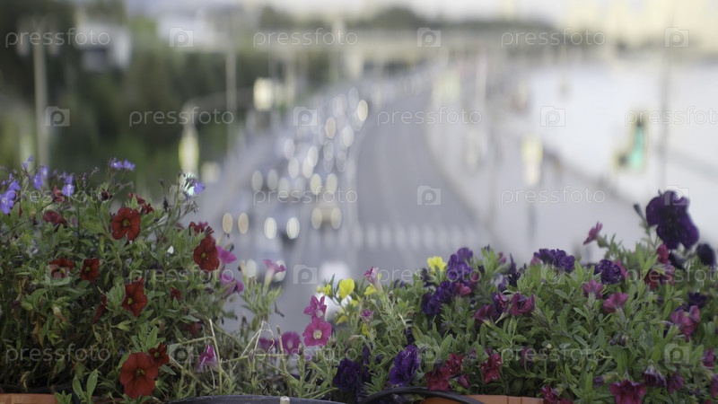 Абсолютно великолепное представление ярких, красочных цветов с видом на шумную городскую дорожную сцену