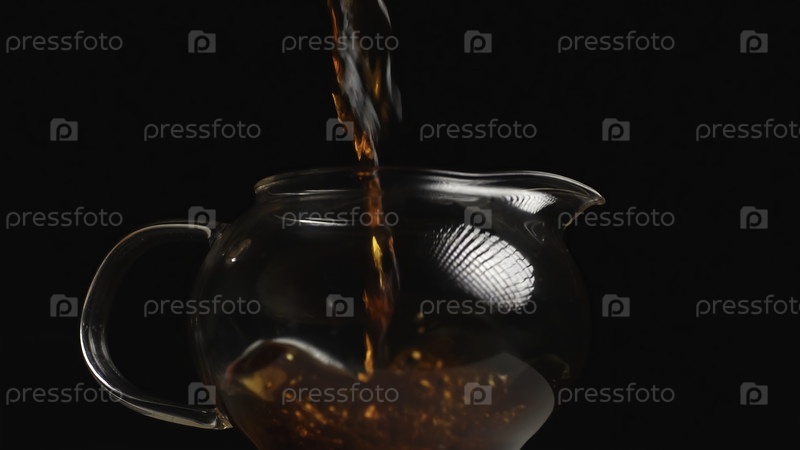 Потрясающий и красивый снимок кипящего чая, грациозно залитого в стеклянный чайник на черном фоне