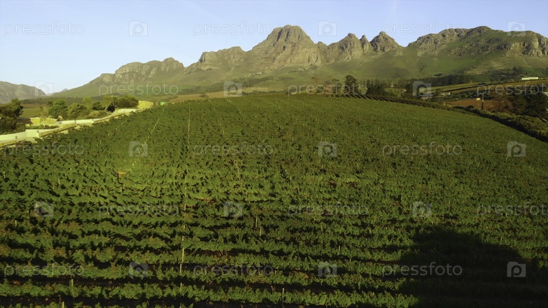 Воздушные изображения, захватывающие структурированную планировку виноградника с горным фоном для оценки виноделия