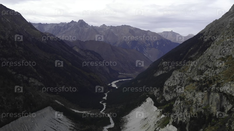 Вид с воздуха, летящий над горной долиной с рекой