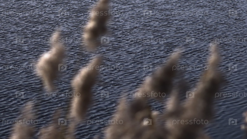 Сфокусированные пампасы травянистые тростники, раскачивающиеся перед водой
