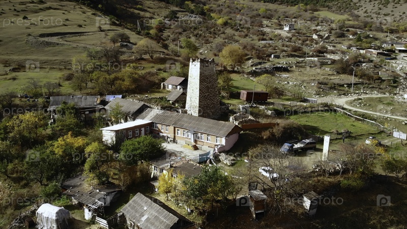 Вид с воздуха средневековой каменной башни в древней деревне