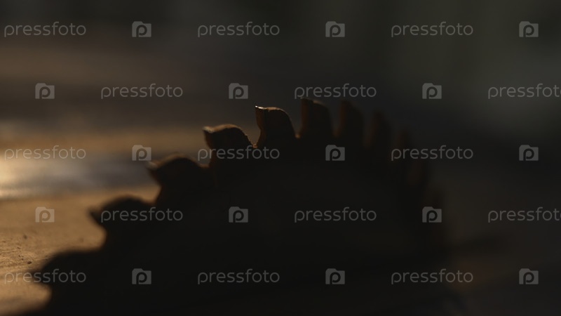 Сцена инспекции с зазубрившимися зубами, освещенными теплым светящимся светом на деревянной поверхности