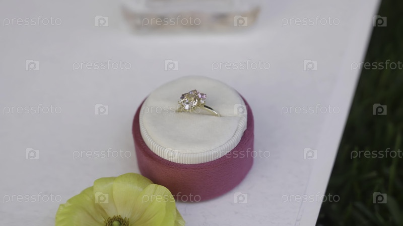 Элегантное кольцо красиво представлено в розовой бархатной коробке, украшенной прекрасными цветочными акцентами