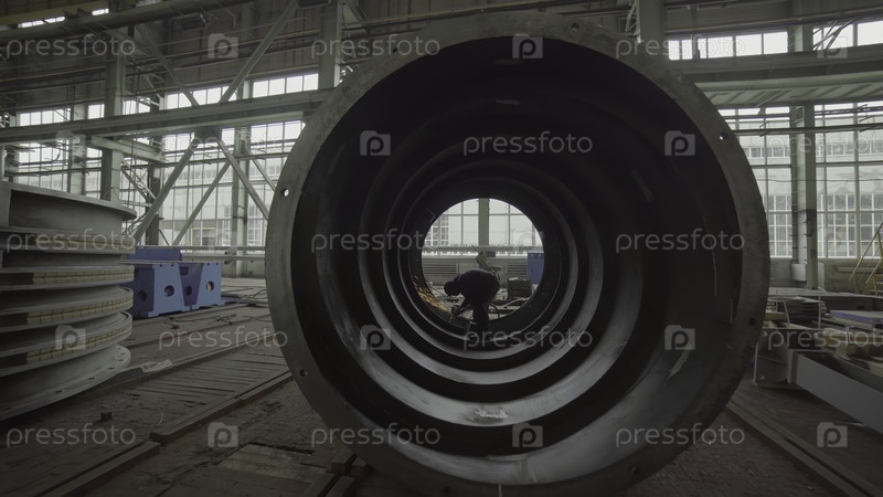 Сцена на фабрике, в которой демонстрируется рабочий, осматривающий большие промышленных трубки, подчеркивающая промышленность и мастерство
