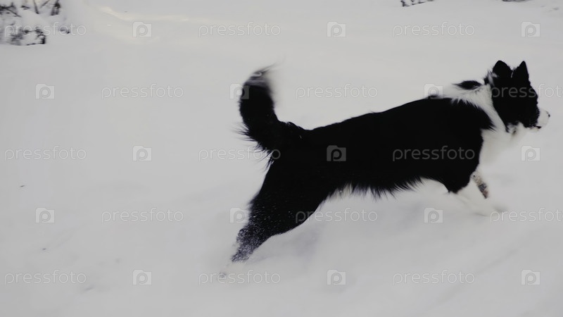 Очаровательная черно-белая собака радостно играет в свежем снежном пейзаже, захватывая красоту зимы