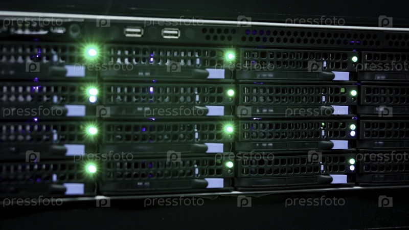 Рак с мигающими зелеными огнями в темном центре обработки данных