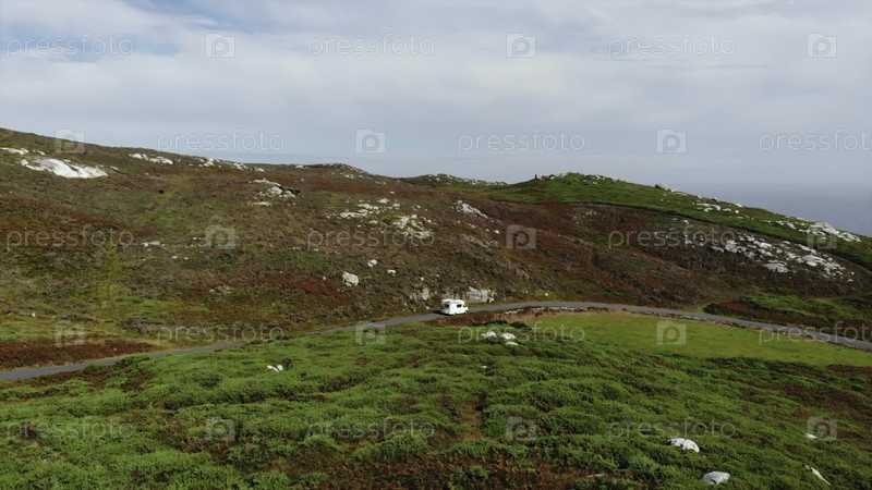 Аэрофотосъемка фургона, едущего по живописной прибрежной дороге.СМИ