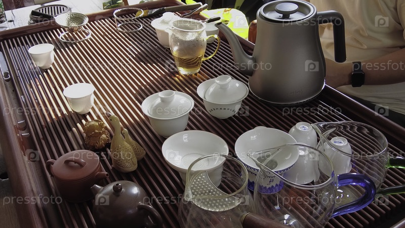 Элегантно устроенная установка для традиционной чайной церемонии, демонстрирующая красивый чайник и различные чашки