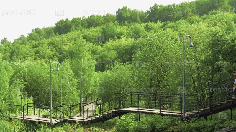Индивидуумы ходят по возвышенной лесной тропе, путешественники перемещаются через пышные зеленые холмы на поднятой дорожке