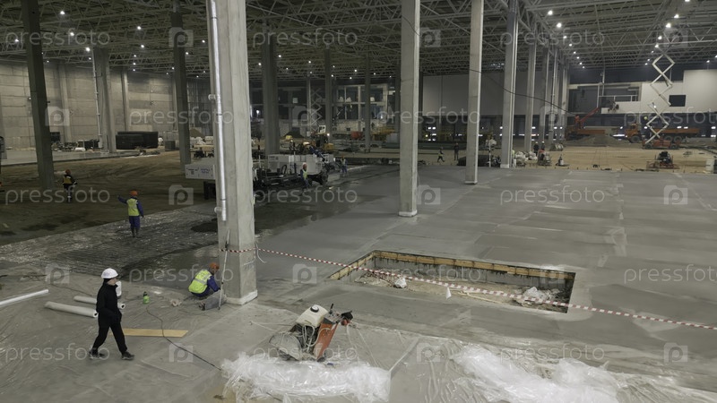 Тбилиси, Грузия - июль 2024 года: строительные рабочие заливают бетонный пол в большом здании