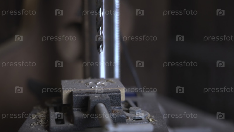 Сверловой пресс вращается и опускается на деревянный блок.Медиа