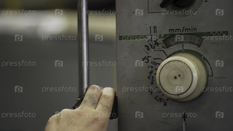 Работник регулирует скорость и частоту подачи на панели управления промышленной машины